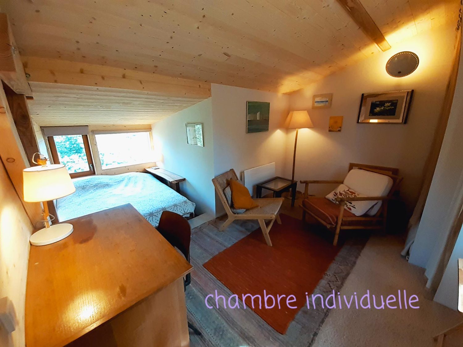 – 1 grande chambre individuelle ou pour couple dans une grande cabane en face de la salle, à 50 m du gîte